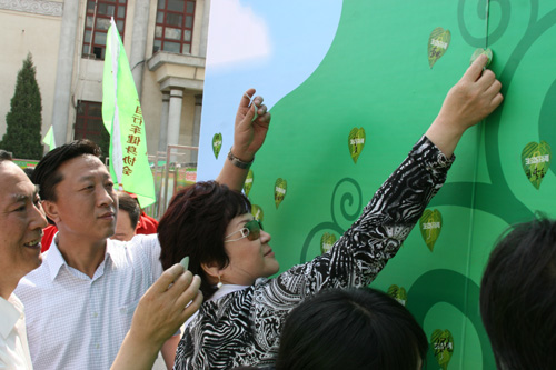 活动最后,与会领导和现场群众在欢快的音乐声中,为“生态汾河”宣传队送行,并在绿树图板贴上签有自己名字的绿叶,以表示支持和参与环保事业。