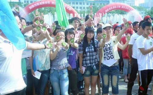 学生们将"生态汾河"的标志贴在手心