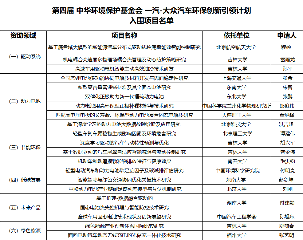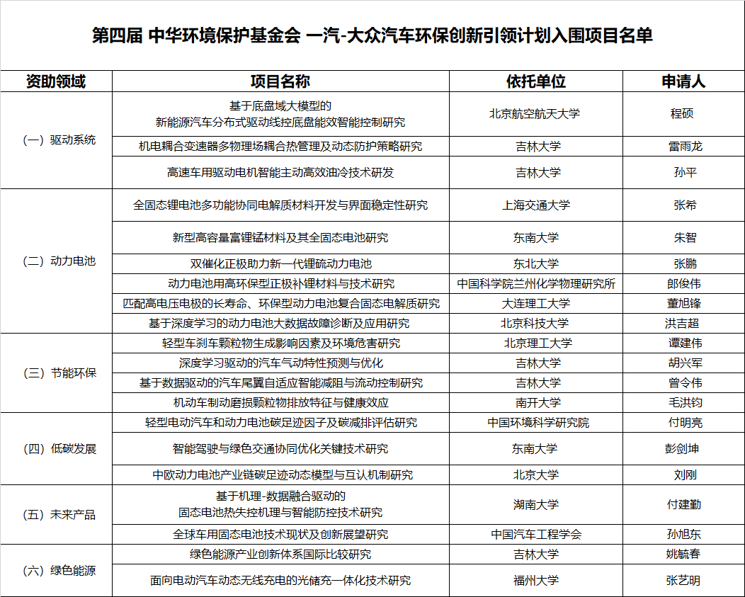 2025年9月29日,由一汽-大众和中华环境保护基金会共同主办的第四届“汽车环保创新引领计划”圆满完成初审工作,在项目组专家的综合评审下,20个具有创新性、前瞻性和产业价值的汽车环保科研项目从全国41个申报课题中脱颖而出,成功入围。这些项目涵盖低碳发展、动力电池、节能环保、绿色能源、驱动系统和未来产品六大领域,充分展现了中国汽车产业绿色转型的前沿探索和前瞻实力。