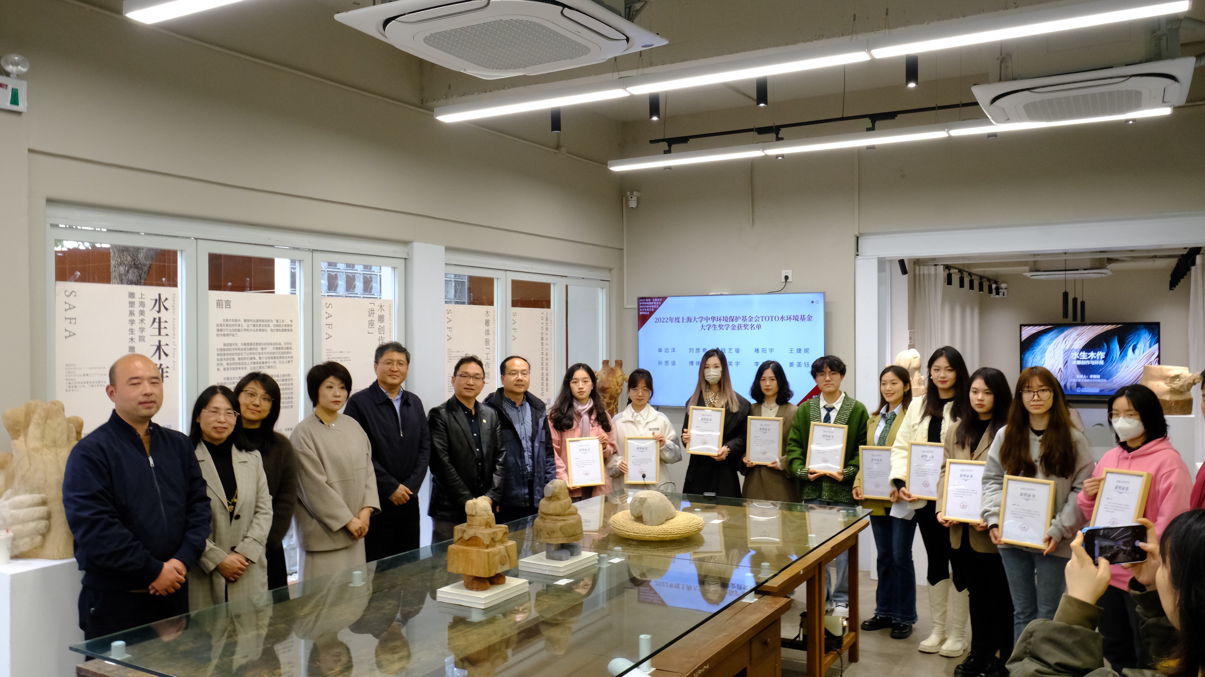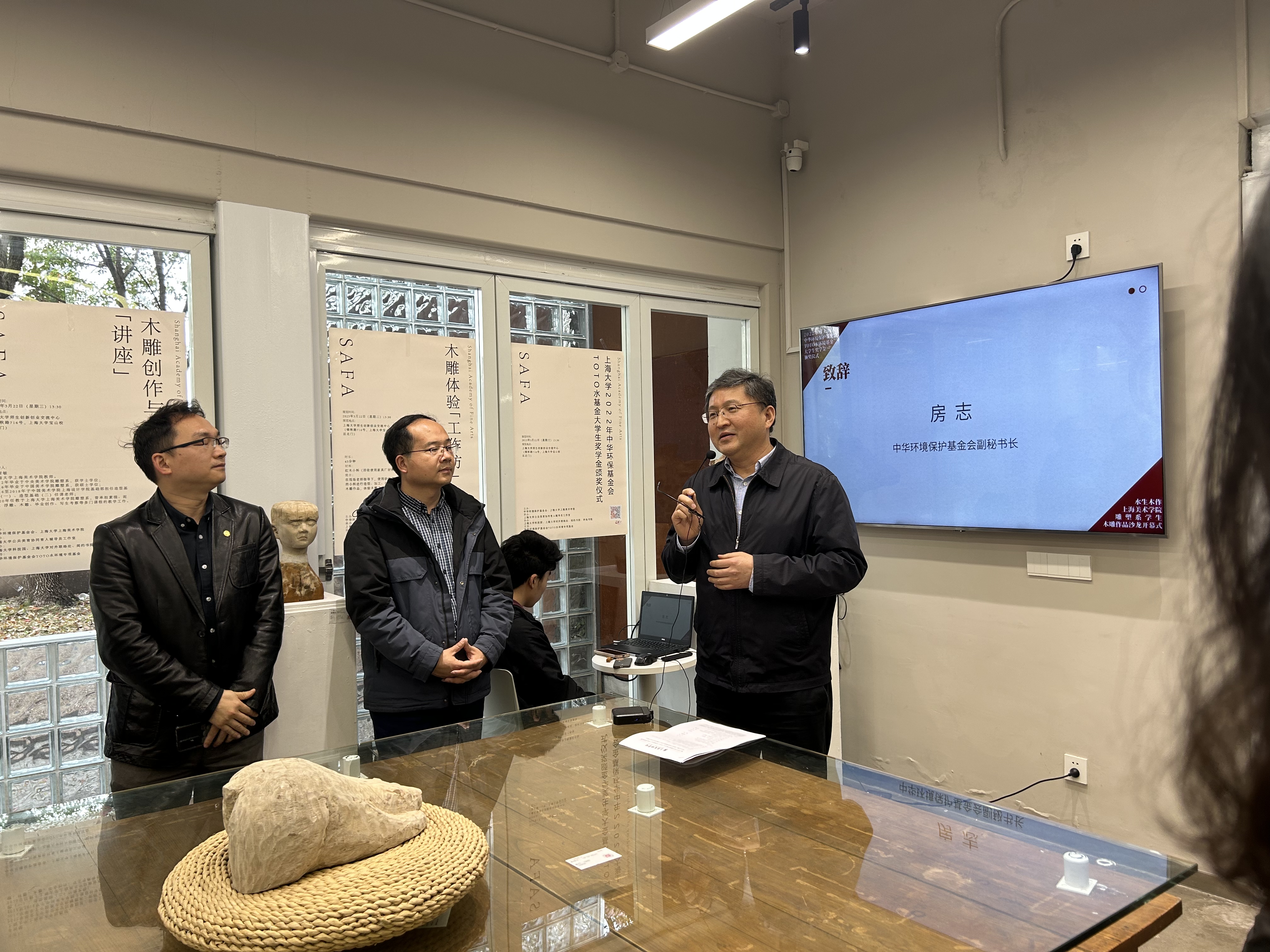 我会TOTO 水环境专项基金与上海大学已经合作了10年,今年我们创新形式,邀请专家学者以木雕创作与环保为主题讲座,以此讲座引导启发同学们的专业学习思路,激励同学们以绿色环保理念与创作设计能力相结合,守护环境,共建美丽中国。