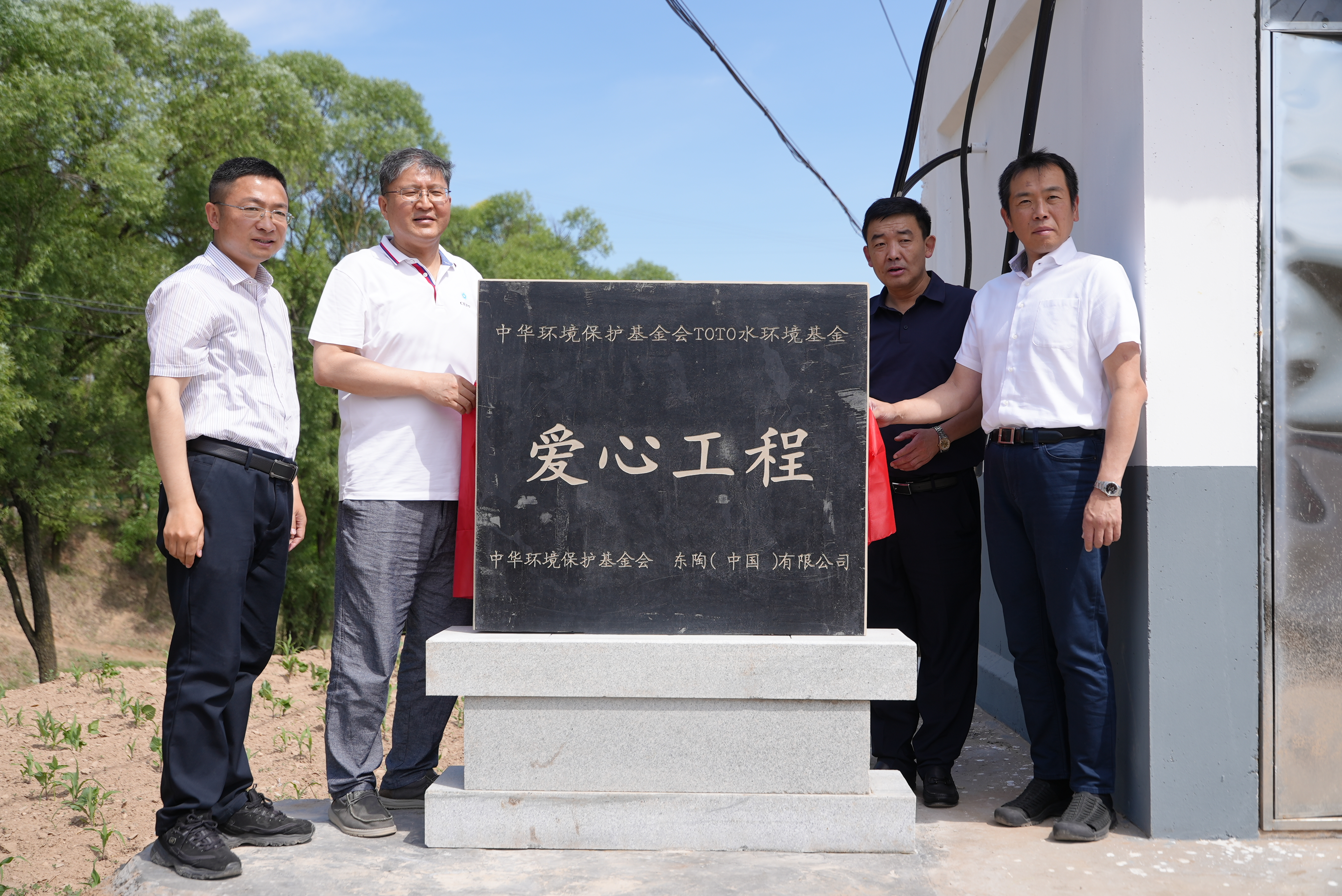 中华环境保护基金会副秘书长房志(左二)、陕西省生态环境厅延安督察局副局长鲁蓉国(左一)、东陶(中国)有限公司副总经理矢岛敦(右一)、子长市杨家园则镇史家畔便民服务中心负责人薛云(右二)共同为项目揭牌。