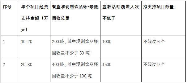 2. 本次经费支持采取梯度支持机制,对于回收量较高,能覆盖所在城市更多区域、更多宣传人次,或开展形式更丰富的宣传活动的单位,可申请更高额度的经费支持。具体标准可参照下表: