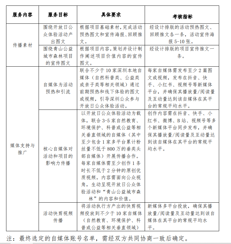 1.活动策划:策划设计一场为期2.5天的、面向商家、媒体和社会公众的公益项目开放日公众体验活动。活动地点深圳市深圳湾公园潮汐湿地(面向公众免费开放场域)。活动需围绕“青山公益城市森林”潮汐湿地项目,以生物多样性保护与零废弃为主题,兼具科普性、互动性和创意性;