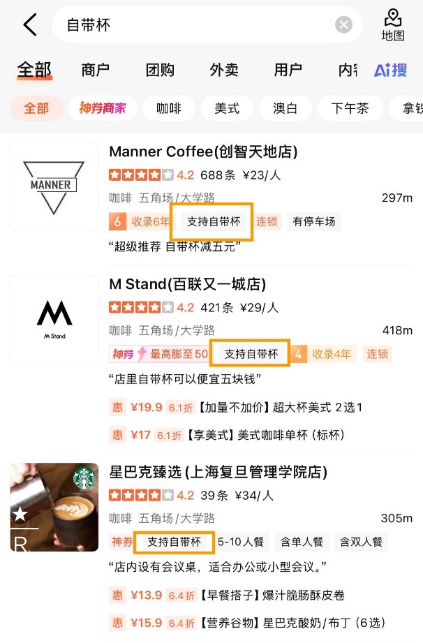 商家可在线上展示支持自带杯及优惠等信息(图源:大众点评App截图)