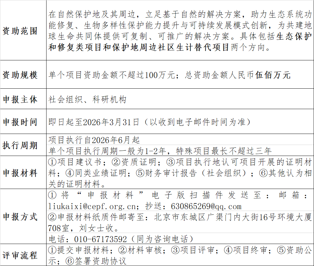 为响应全球生物多样性治理共识,落实我国生物多样性保护相关战略规划,中华环境保护基金会美团青山公益专项基金正式启动“青山公益自然守护行动”第三批资助计划,面向全社会公开征集优质环保公益项目,以公益力量助力生态保护与可持续发展。项目资助主要信息如下(如有意申请,详细要求请见附件1申报指南):
