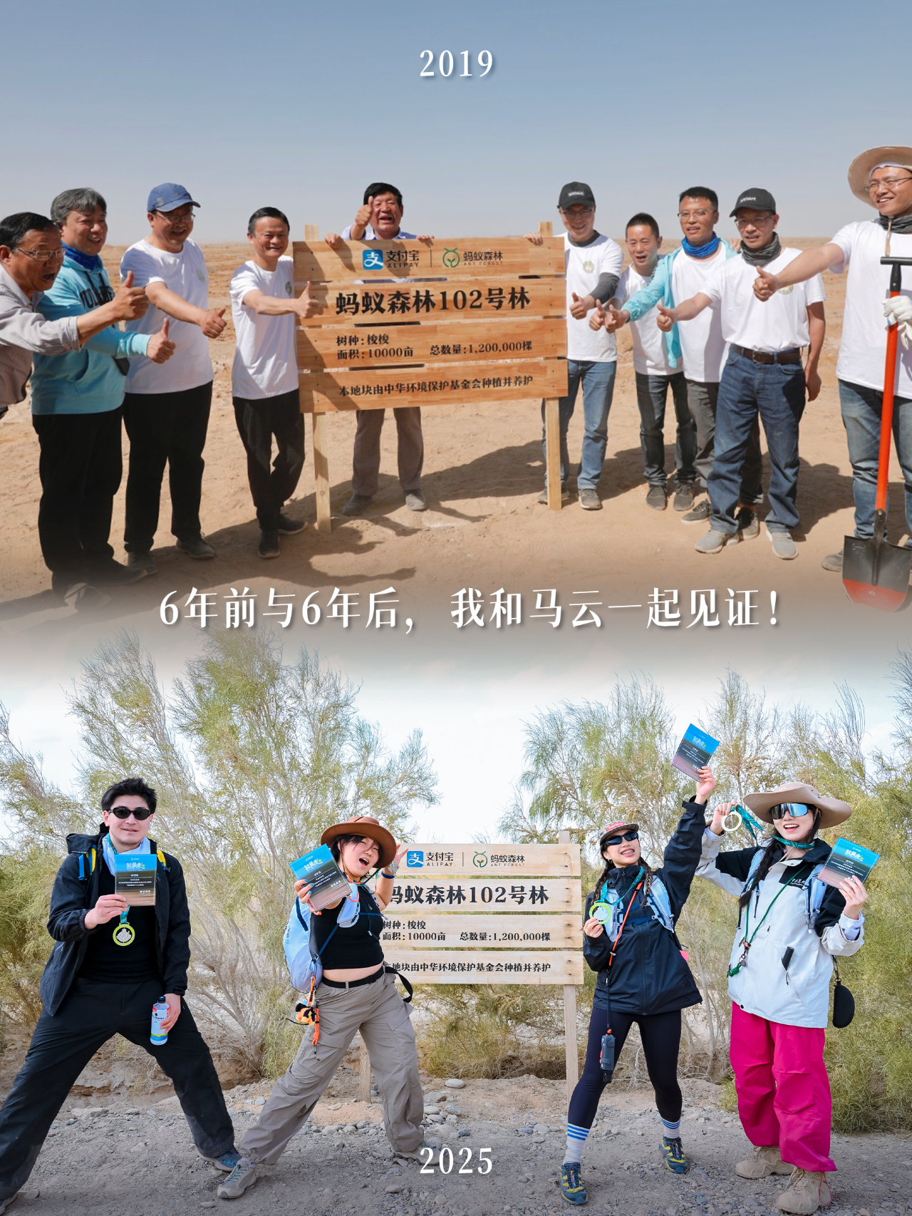 2019年春季,也是来自全国各地的蚂蚁森森林用户代表,和马老师一起种下了第一批幼小的梭梭苗。如今,经过时光的洗礼,迎着戈壁的风沙,曾经的“寸草不生”,早已“绿树成荫”,最高的梭梭树已达 3 米。