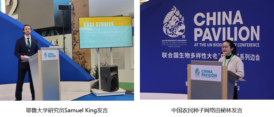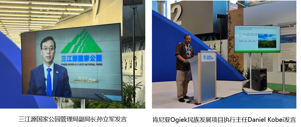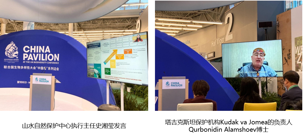 参会嘉宾和各机构代表围绕原住民与本土社区的传统知识、治理与可持续利用对生物多样性保护的贡献等议题,展示了来自全球的社区保护典型案例,深入讨论如何推动政府、社会组织、学术机构、企业和本土社区合作,建立长期的伙伴支持关系,共同实现将本土社区的参与和共享在生物多样性保护中主流化的目标。山水自然保护中心理事长孙姗在致辞中引用数据强调,原住民虽然只占世界人口的5%,但是保护了80%的生物多样性,本次边会的目标在于将本土社区的各利益方联动起来,相互学习及交流对话。国际原住民和社区保护联盟Carolina Rodriguez和北京大学教授、山水自然保护中心创始人吕植在边会上作了主旨发言。Rodriguez女士分享了国际原住民和社区保护联盟积极支持原住民与本土社区的工作,在保护环境的同时帮助他们发展经济生产的工作,并介绍了亚非拉等地十多个原住民民族对于自然和自我认知的体系,例如刚果把森林作为社区人民精神生命的一部分,以及厄瓜多尔亚马孙雨林里七个民族保护雨林等故事。吕植教授分享了她在保护学领域研究的心路历程,介绍了自己在藏区认识的两位佛教僧人所讲的藏族文化里神山、神与自然、自然与人的关系,人与自然万物平等的理念;还介绍了在四川关坝社区的人们结合现代社会的市场经济,发展蜂蜜产业,不仅保护了本土的蜂蜜种群,还增加了社区人们的收入,当地政府近年来也大力支持推广这些工作,补贴蜂蜜生产。吕植教授说:“不论什么社区,我们都要意识到,人类是大自然的一部分。要把本土知识融入到我们的世界观中。”