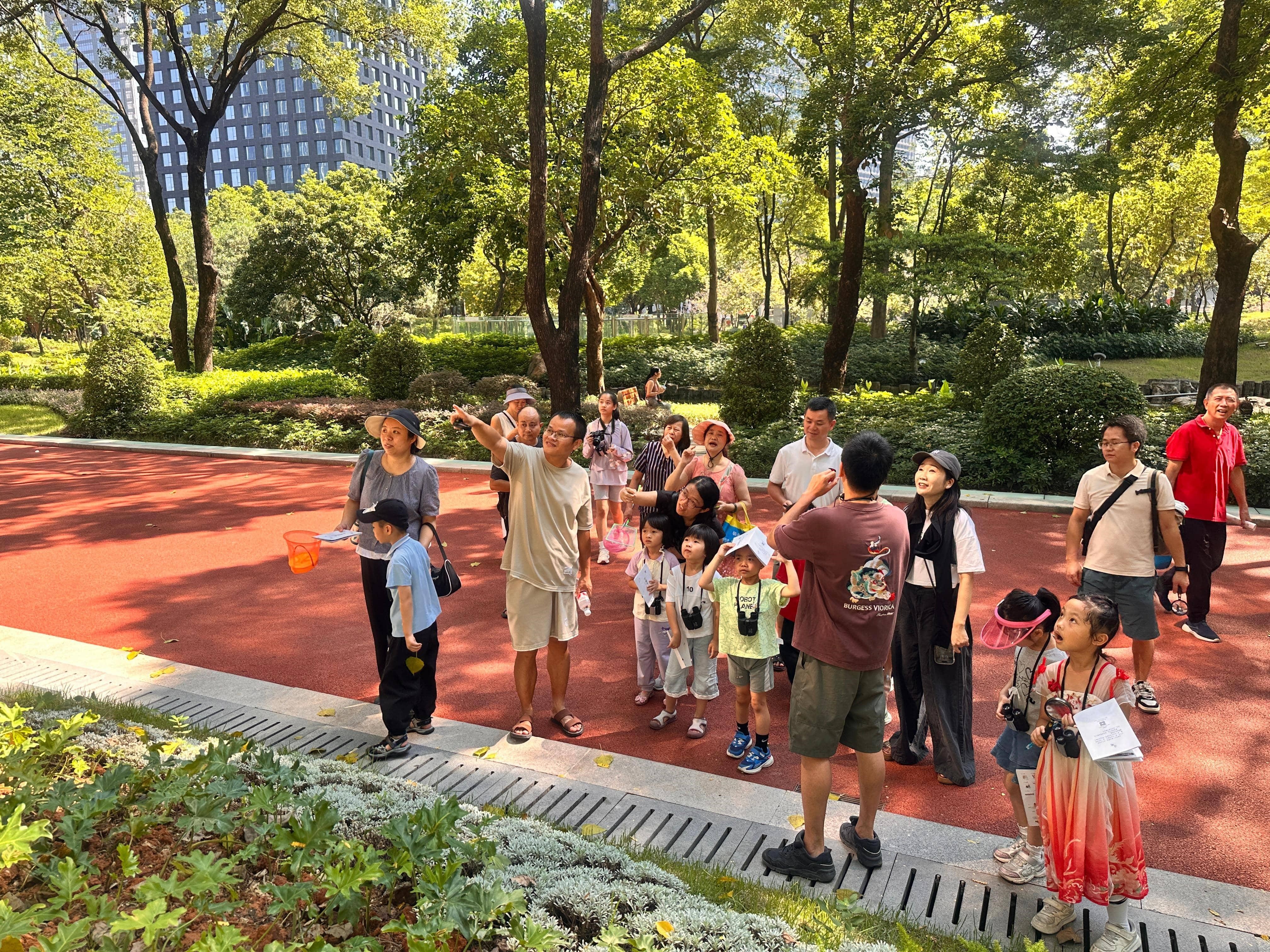 在花城广场的自然观察活动中,35组亲子家庭跟随导赏员,借助望远镜、放大镜与观察手册,记录鸟类的形态特征与行为习性,认识广场上新植的乡土植物。孩子们好奇地观察着每一只掠过枝头或在水边嬉戏的鸟儿,认真记录下鸟的大小、颜色、嘴型和行为特征。这种直接的自然体验,让亲子家庭在探索中建立起与身边自然的真实联结。