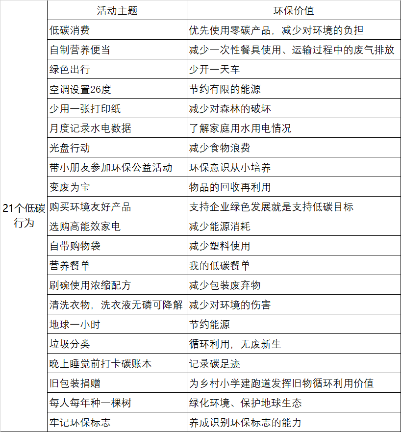 活动需围绕“21个低碳行为”展开,结合以下主题进行策划与设计,将“21个低碳行为”融入一天的低碳生活中,围绕衣、食、住、行等生活场景,设置展览、游戏、互动装置等多种形式的低碳体验内容。