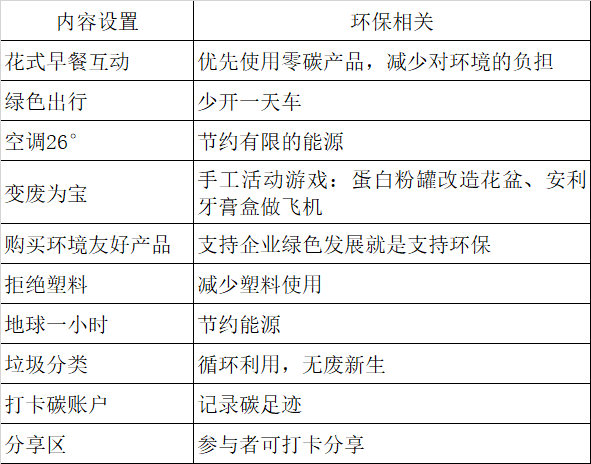 其中“花式早餐”、“分享区”、“打卡碳账户”为活动的内容核心(作为地方必选项目)。活动需要通过在各版块设置互动环节,将低碳生活方式贯穿其中,使参与者在寓教于乐中加深对环保的理解,从而有效传递绿色理念。