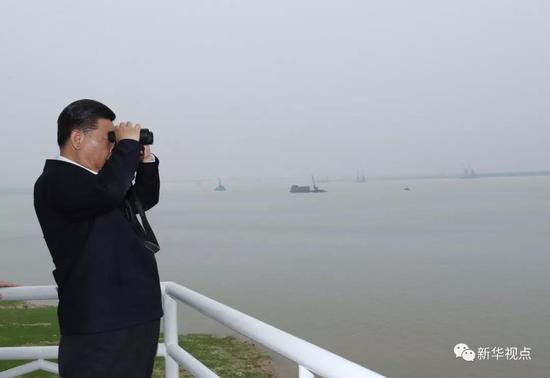 2018年4月25日,习近平总书记乘船考察长江,抵达石首港。随后,驱车一个多小时来到湖南岳阳,考察了位于长江沿岸的岳阳市君山华龙码头。这里曾经是非法砂石码头,如今已经整治复绿,尽显生机。新华社记者鞠鹏 摄